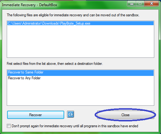 If Sandboxie brings a prompt up asking to recover files out of the Sandbox, click ‘Close’.