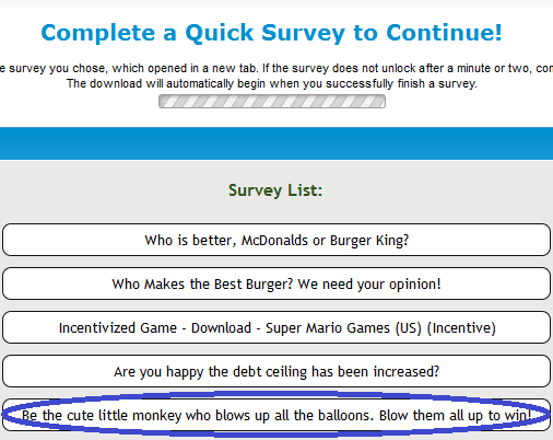Copy and paste your link into the Sandboxed browser. When you see the infamous ‘Complete a Quick Survey to Continue!’ box, there should be at least one option to download some sort of game or toolbar. A lot of the time they don’t go right out and say that it’s a download just from the description, but ones that usually don’t ask for your opinion/personal info are the download ones. If you’re not sure, just click on them to check. I’m going to do the ‘Blow up all the balloons’ one.