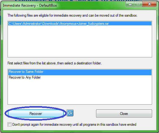This time, however, when you download the actual file you were trying to, select ‘Recover’ when the Sandboxie prompt comes up.